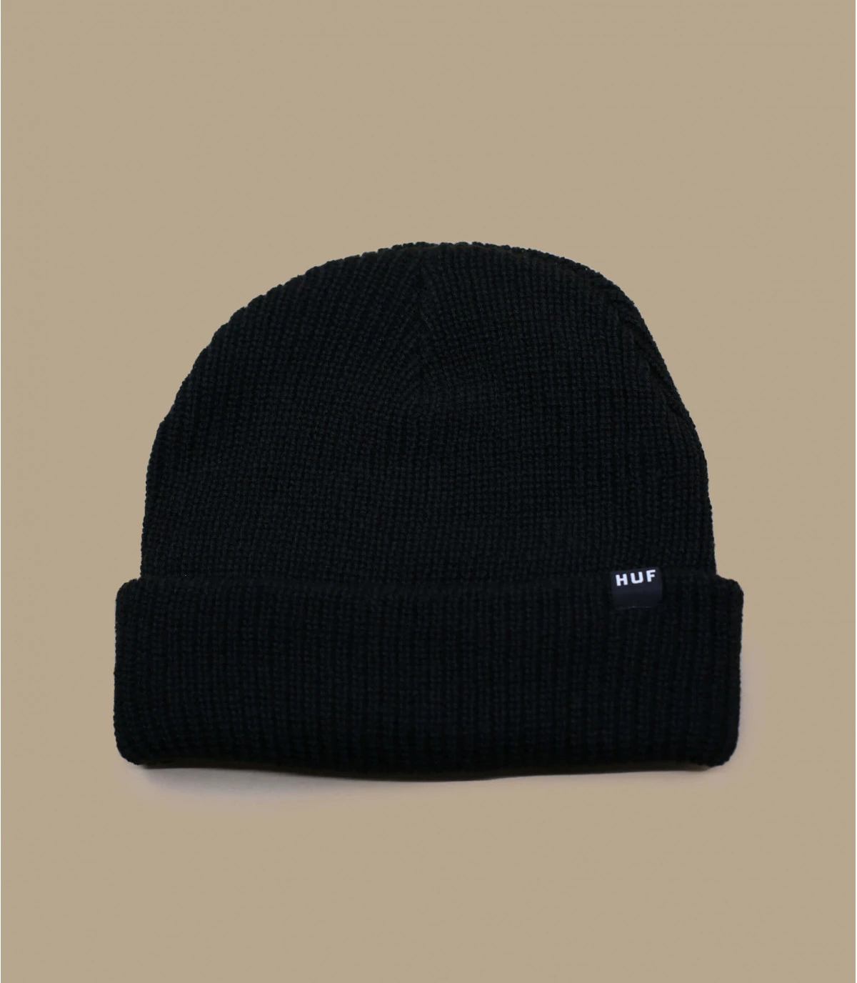 Bonnet à revers noir en acrylique avec un petit patch Huf cousu sur le revers.