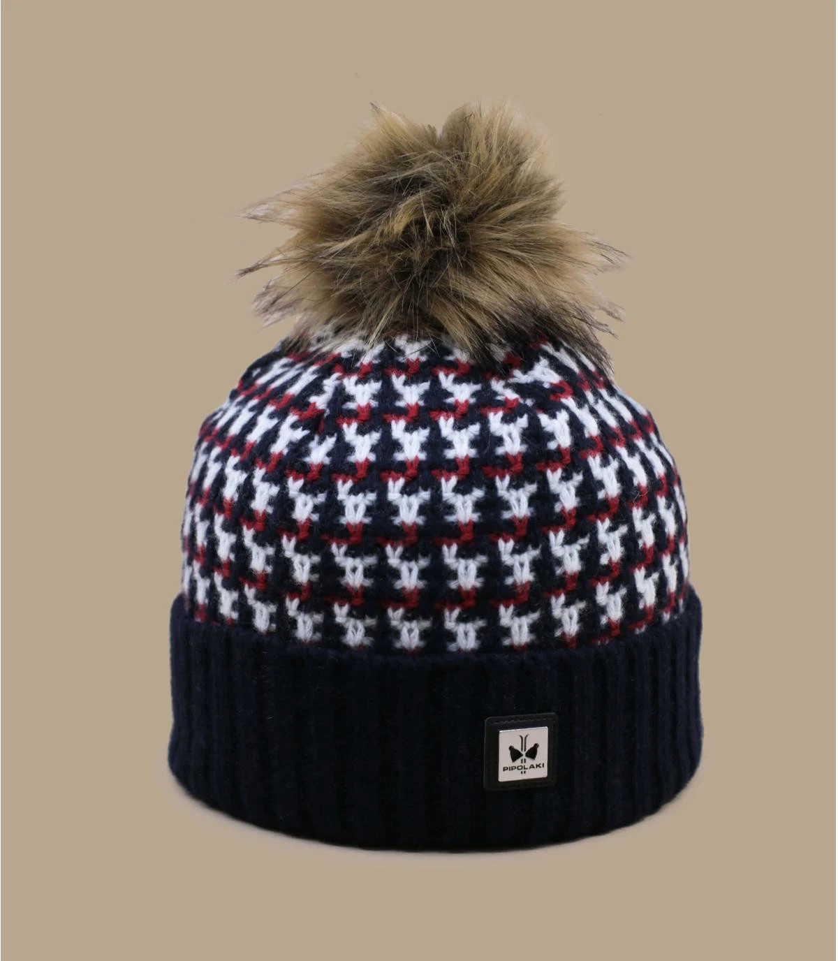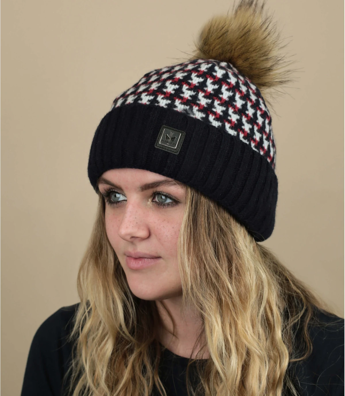 De style légèrement rétro, ce bonnet à pompon bleu marine pour femme, idéal pour le ski, arbore un motif à carreaux rouge et bleu et un joli pompon. Sa fabrication est écologique à partir de fibres recyclées en Italie.